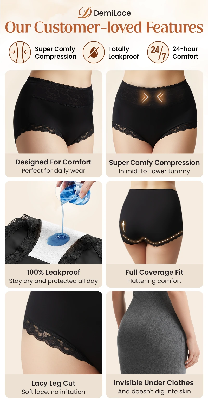 Built with advanced multi-layer leakproof technology, Demilace absorbs up to 2oz of liquid.